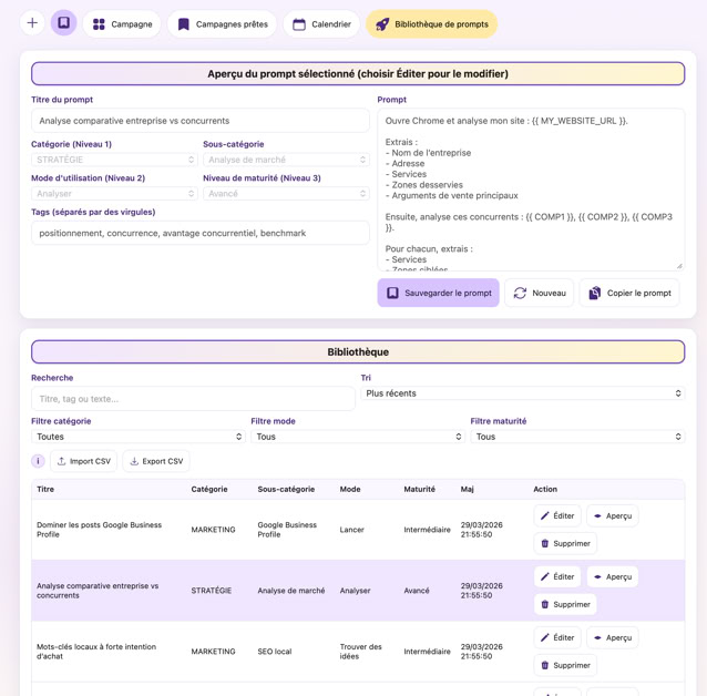 À centraliser vos prompts, les classer (catégorie/mode/maturité), les retrouver vite, et réutiliser vos meilleurs templates.